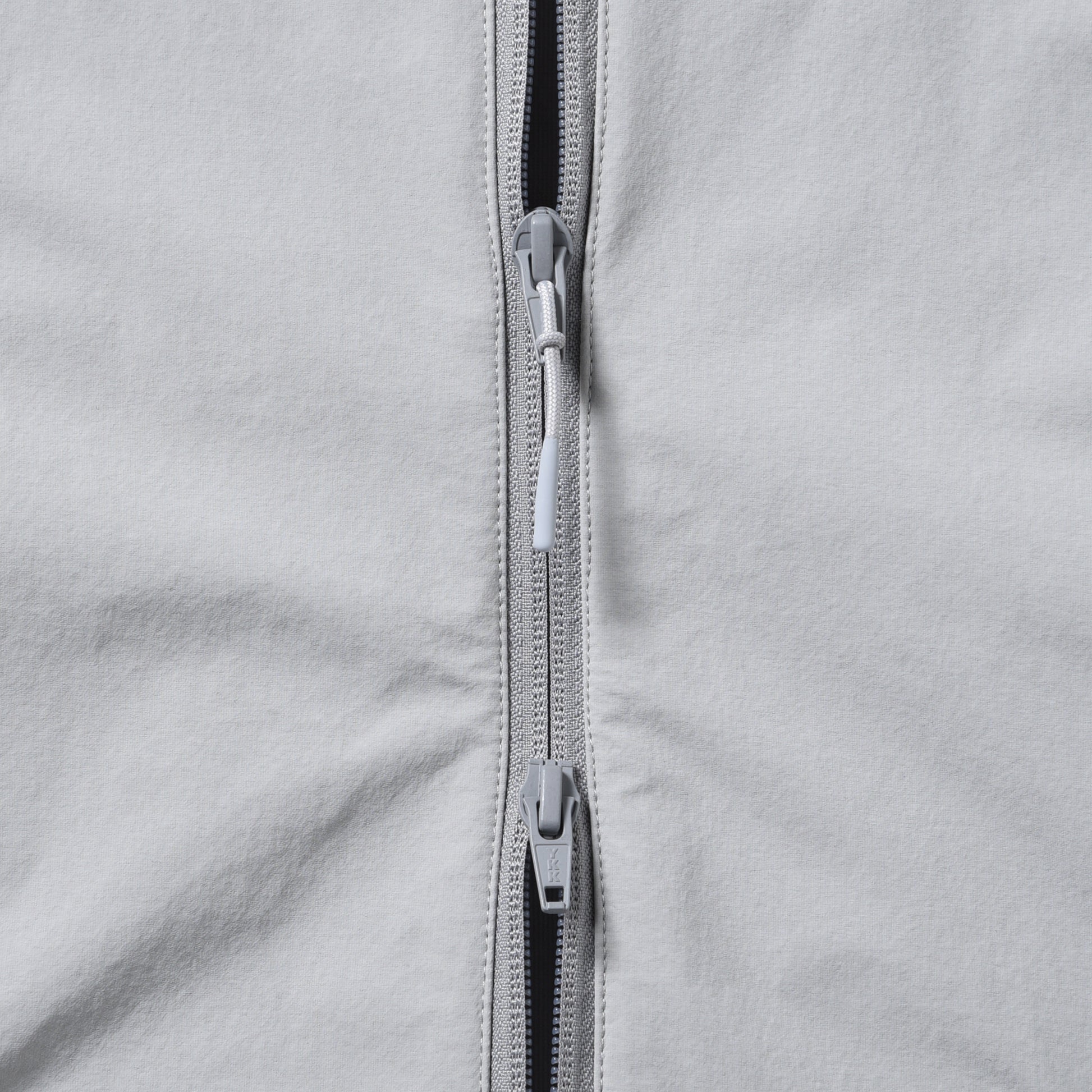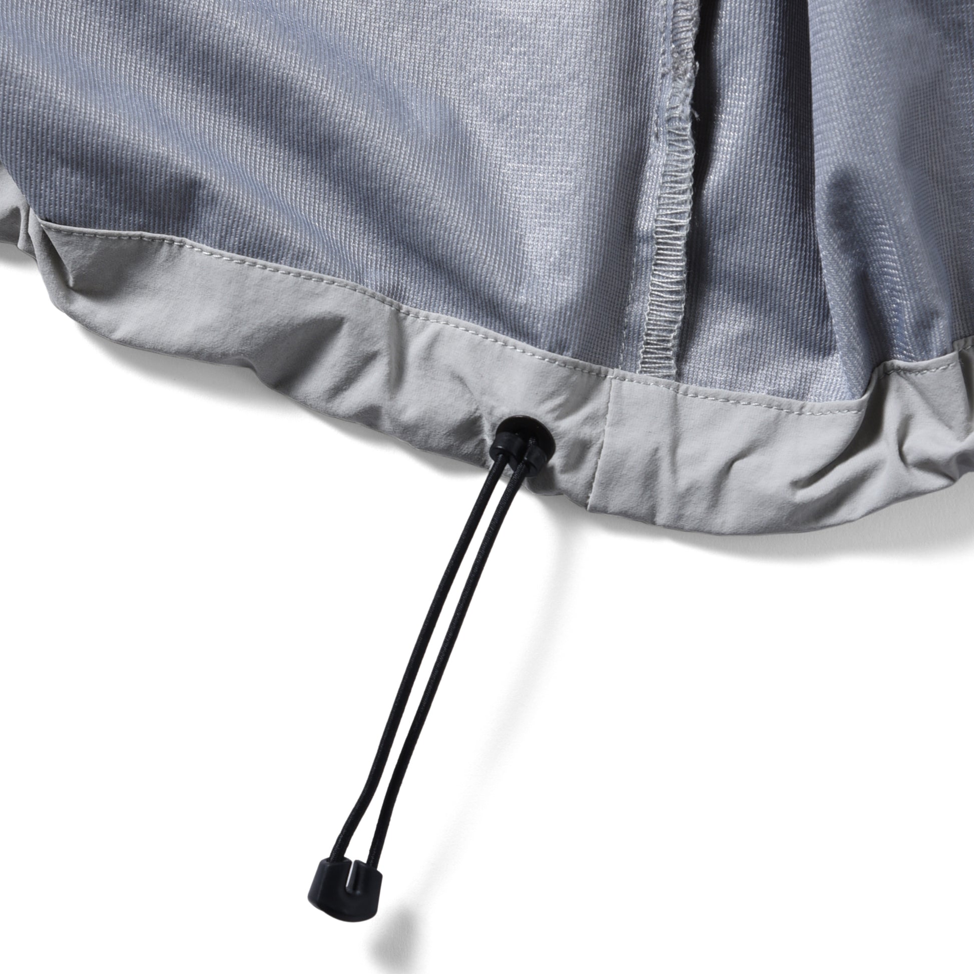 外からは、雨、風を防ぎ、内側は汗をかいても服の内部がベタつきにくく、快適さをキープします。新色のライトグレー。